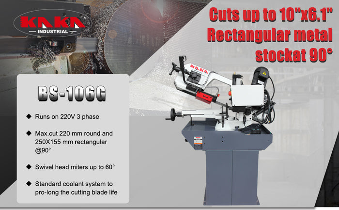 KAKA Industrial BS-106G horizontal bandsaw Metal Cutting Band Saw, Cuts up to 9” round metal stock at 90°. Swivel head miters up to 60°. 220V-3PH is backordered and will ship as soon as it is back in stock.