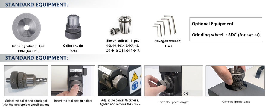 Standard with CBN grinding wheel for the HSS material, optional SDC grinding wheel for the carbide material.