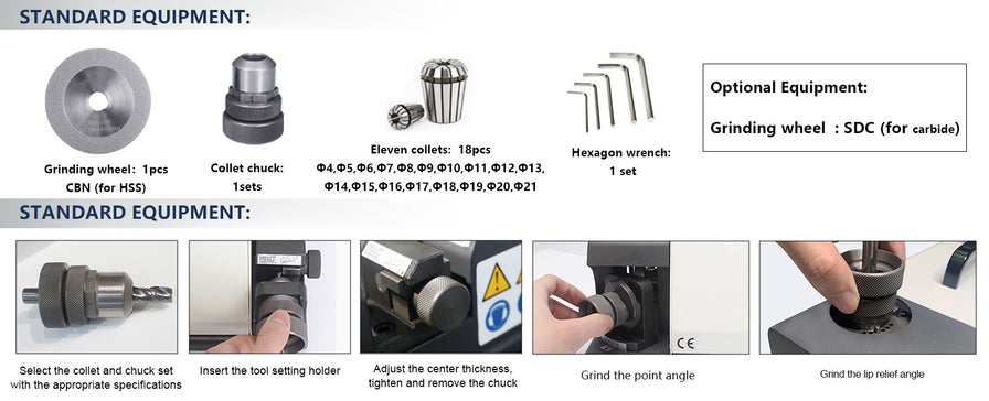 Standard with CBN grinding wheel for the HSS material, Optional SDC grinding wheel for the carbide material.