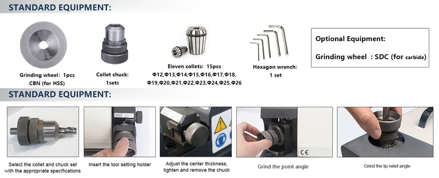 With the Taiwan Grinding Wheel, only one piece can complete all procedures, have an accurate angle, and have a long service life. A CBN grinding wheel for the HSS material and an optional SDC grinding wheel for the carbide material is standard.