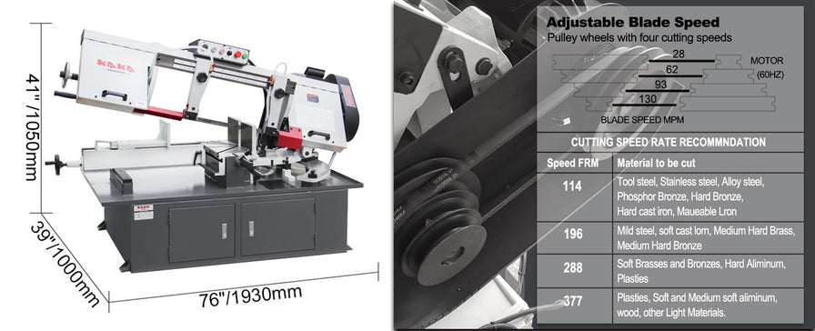It runs on 220 V power, a 2 HP motor, a gear drive, and 4 cutting speeds of 28,62,93,130 MPM. The powerful motor provides the torque to drive the bandsaw blade through metal workpieces efficiently and accurately. The bandsaw can cut through round metal workpieces with a maximum diameter of 10.2 inches and is suitable for cutting round bars, pipes, and other cylindrical stock materials.