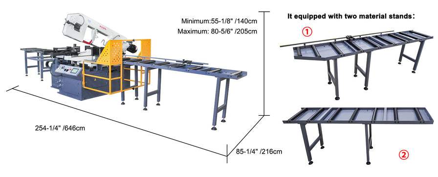 It is equipped with two material stands, and the total assembled length is 254-1/4 inches. It safely supports longer workpieces, reducing the risk of bending or vibration during cutting. It also maintains alignment for extended materials, enabling more accurate cuts.