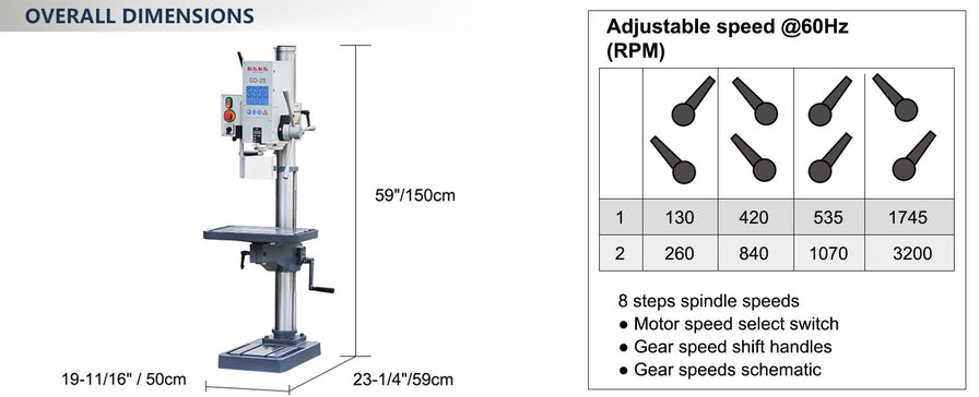 This gearhead vertical drill press has a capacity of up to 4.92". It has an 8-step spindle speed switch and a double-speed motor with forward and reverse turning switches.