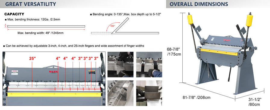 - Versatile Bending Capabilities: Capable of bending up to 12-gauge mild steel over the entire 49” length, this brake supports both box & pan and straight bends with adjustable angles from 0° to 135°, accommodating various sheet sizes and thicknesses.